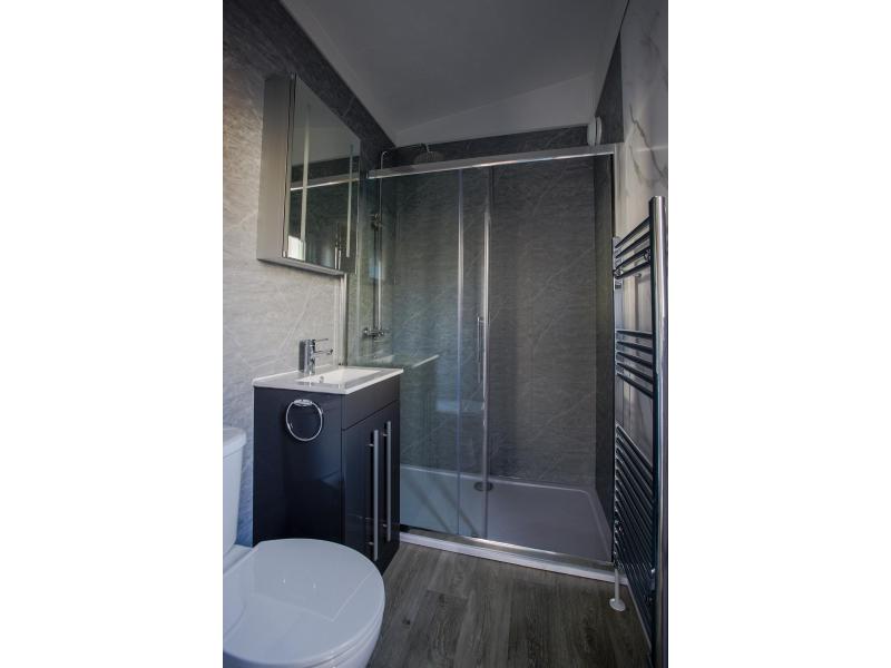 De badkamer is stijlvol afgewerkt met een ruime douchecabine, een modern wastafelmeubel met spiegelkast en een toilet. Ook hier komt het strakke design terug, wat zorgt voor een luxe en frisse uitstraling.