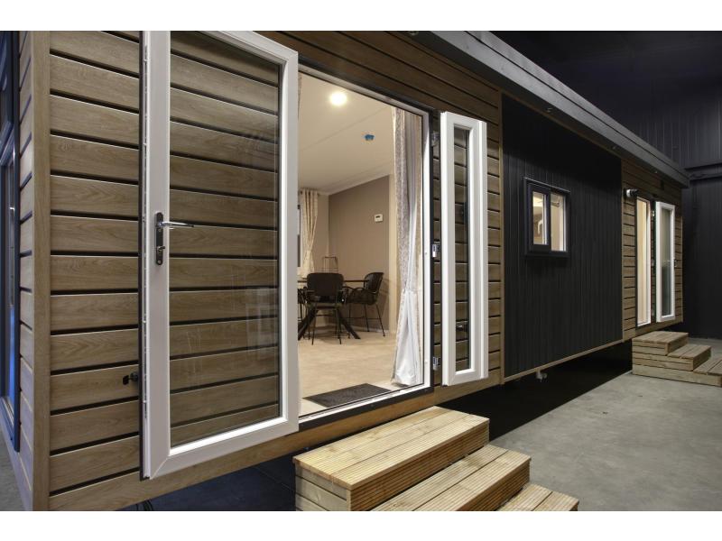 Dit nieuwe chalet "Lessenaarsdak Special 1000/2" zonder staanplaats met moderne houtlook gevel (Vinyplus) is nu te koop bij Kuiper Caravans in Noord-Holland!