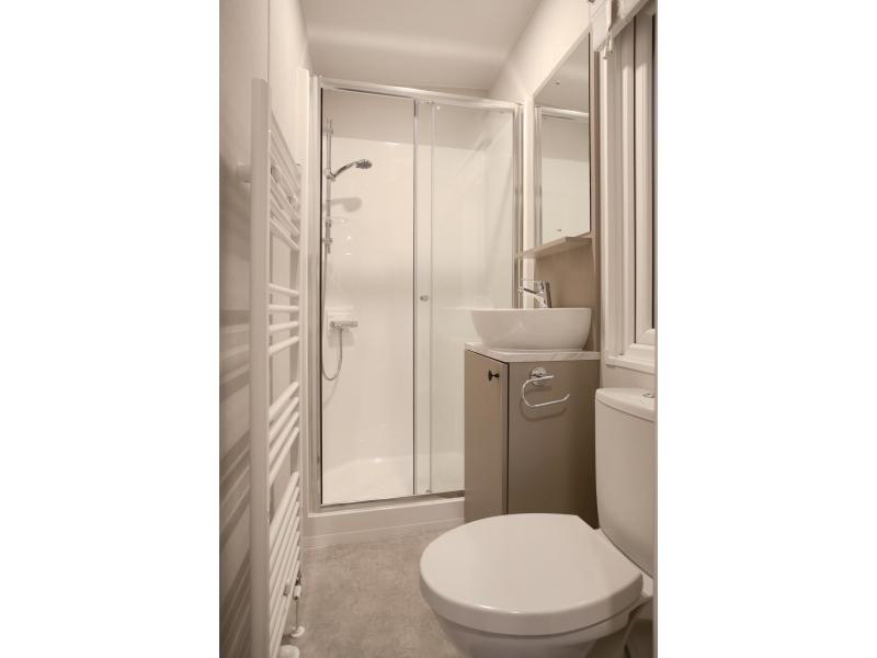 Een oase van rust, met een ruime douchecabine, strak badkamermeubel en een designradiator voor warme handdoeken.