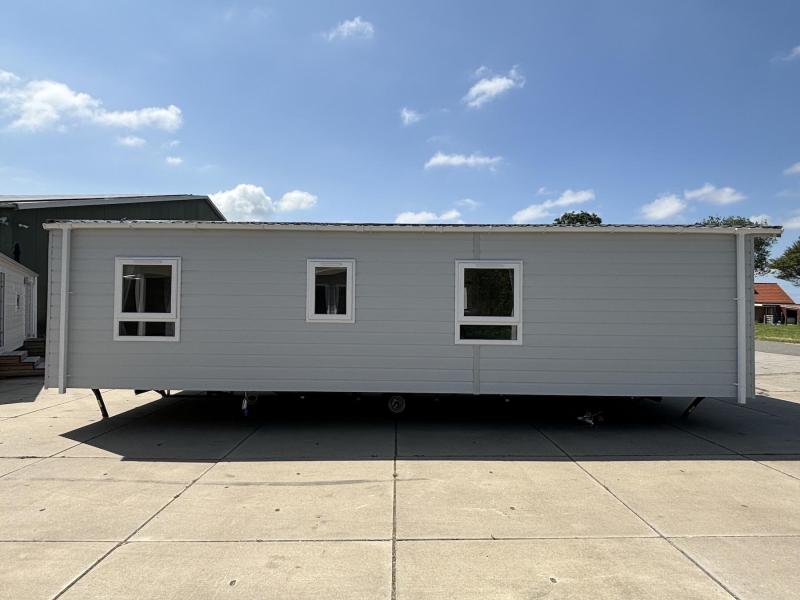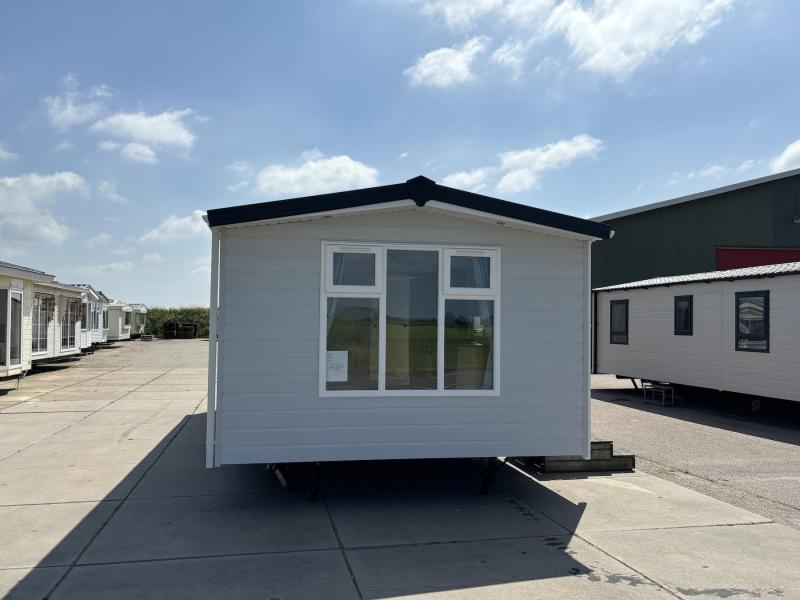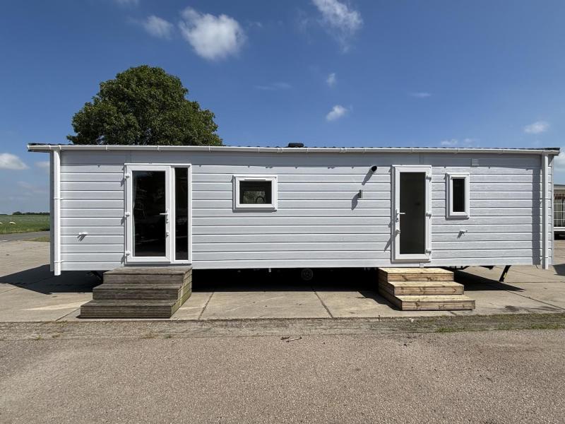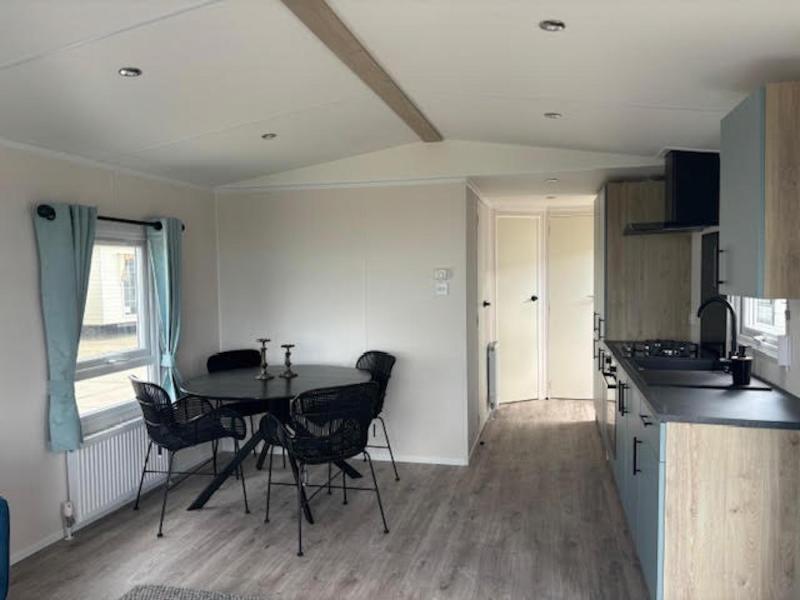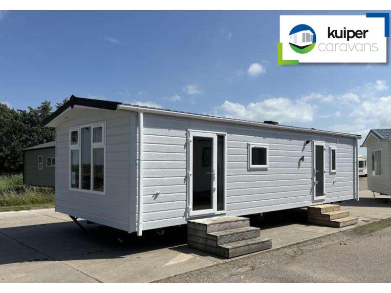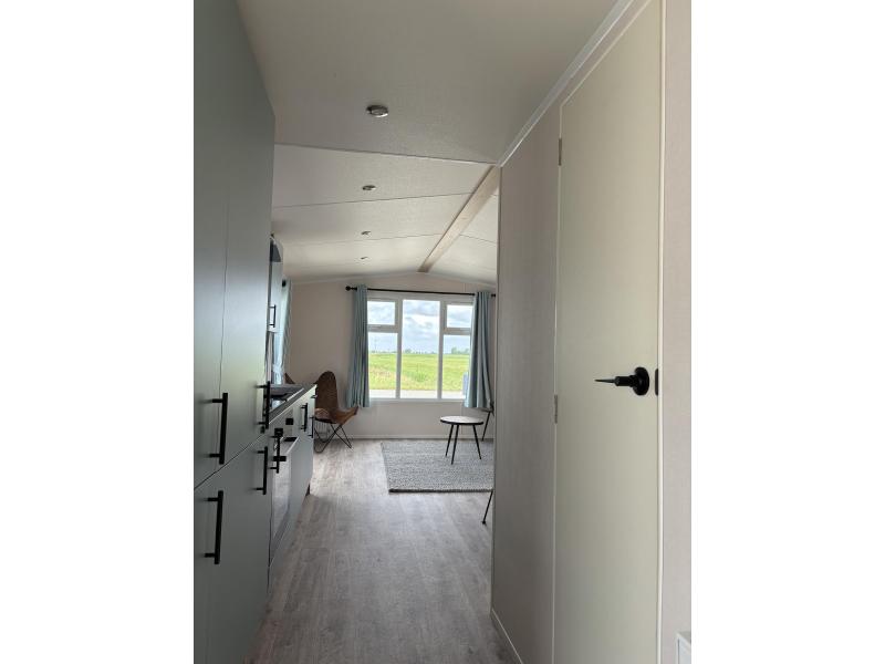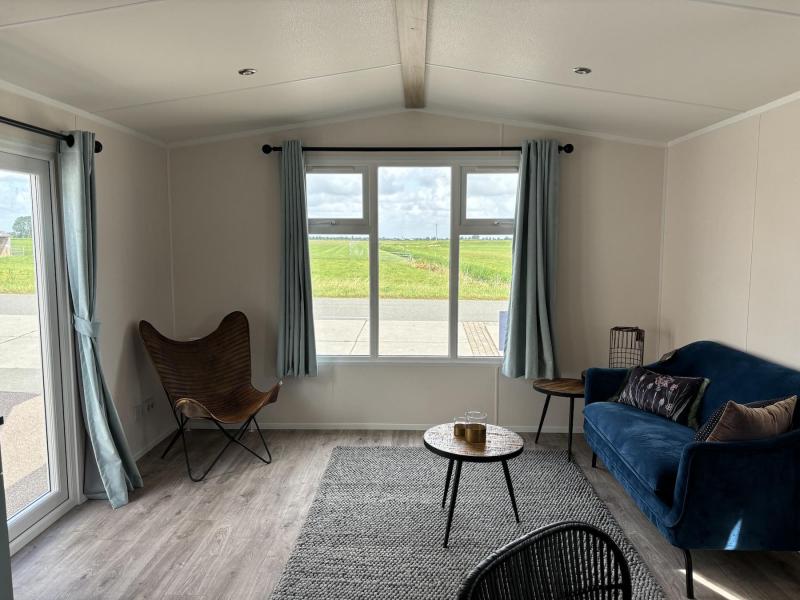 Het chalet "Costa" met kunststof buitenbeplating en kunststof kozijnen zonder staanplaats te koop bij Kuiper Caravans in Noord-Holland. Als u binnenkomt, wordt u verrast door de frisse oceaankleur, wat een rustgevend en organisch gevoel geeft.