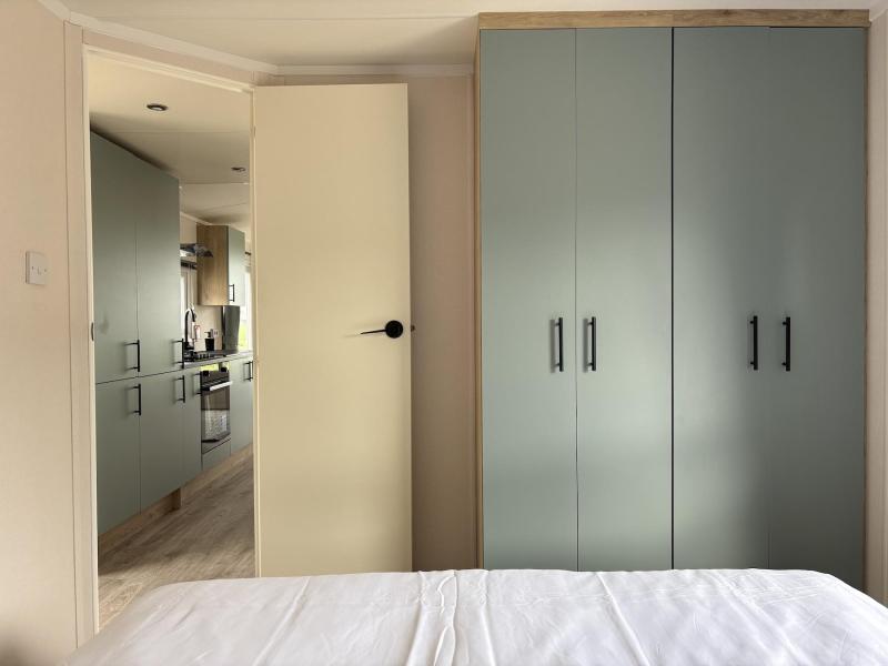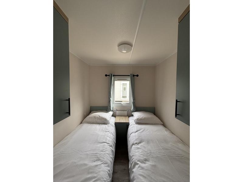 Wij bieden dit chalet aan met 2 slaapkamers, waaronder de eerste kamer met twee eenpersoons bedden met daarbij meerdere wandkasten en de tweede kamer met een tweepersoonsbed en een hoge kastenwand.