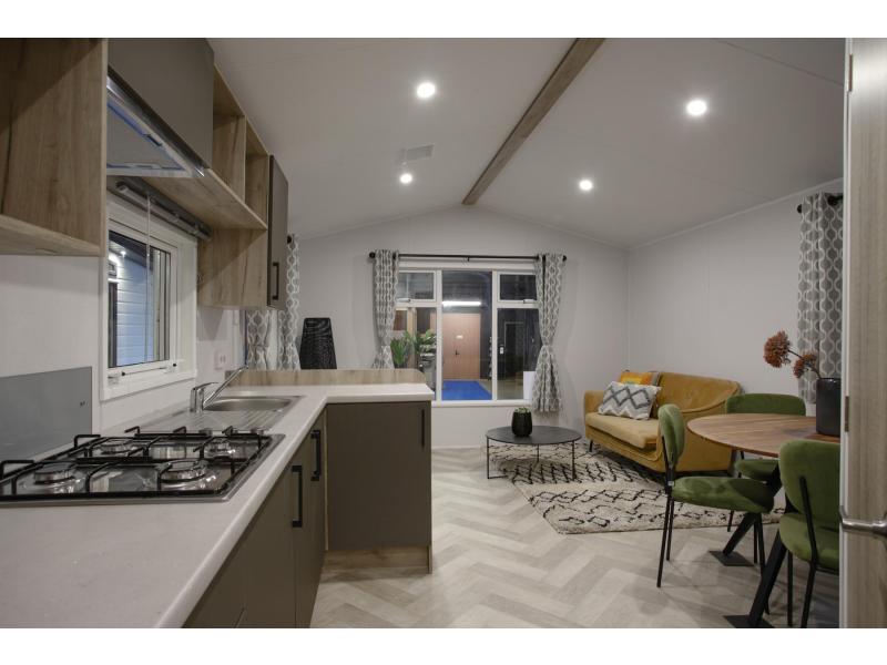 Chalet Vienna, een prachtig afgewerkt chalet zonder staanplaats te koop met witte kunststof kozijnen, dubbel glas, luxe kunststof buitenbeplating en pannendak. Het chalet word verwarmd door middel van een centrale verwarming, intergas ketel.