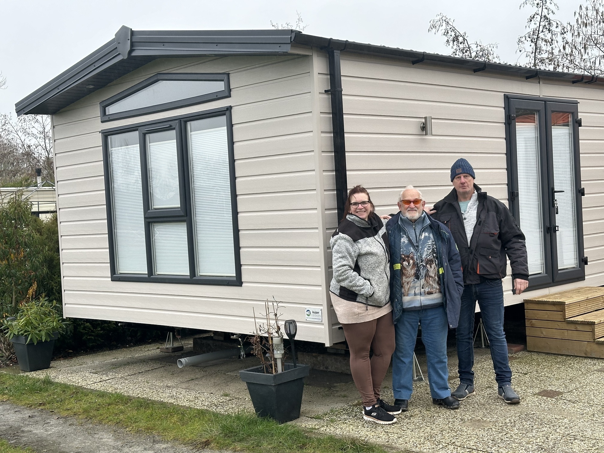 Anja kwam via Cor 4 jaar geleden voor het eerst zakelijk terecht bij Kuiper Caravans. ,,Destijds hebben we onze caravan ingeruild voor een tweedehands chalet. We voelden toen al de betrokkenheid. Rob deed er alles aan om zoveel mogelijk aan onze wensen te voldoen, zo hadden we een chalet met dakpannen wat ik heel mooi vond. Het probleem alleen was: hij was niet goed geïsoleerd. Nu we toe waren aan een nieuw onderkomen, was dat een eerste vereiste van mij en mijn man Frank. Maar Rob dacht ook anderszins met ons mee. Het chalet van het type Paulo dat we gekocht hebben is twaalf meter lang en vier meter breed. Hij is kortom een stuk groter, breder en langer dan het vorige chalet.”