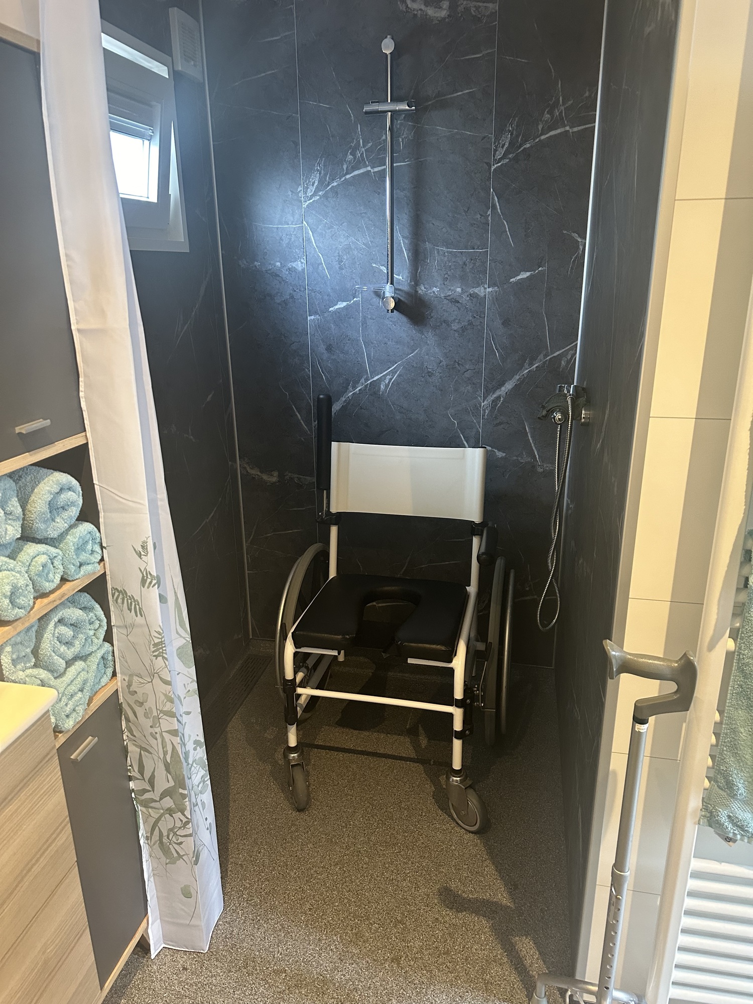 De badkamer is de parel van het chalet, met dank volgens Lia en Jeroen aan Kuiper Caravans en de bouwer van het chalet. ,,Zij hebben ons zeer geholpen met het realiseren van een grote aangepaste badkamer. Met een grote douchecabine en een verhoogd toilet met achter de muren verstevigingen voor handvaten.”