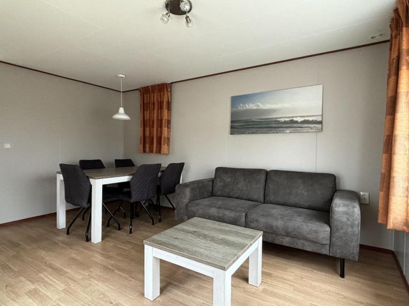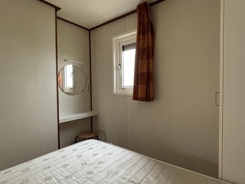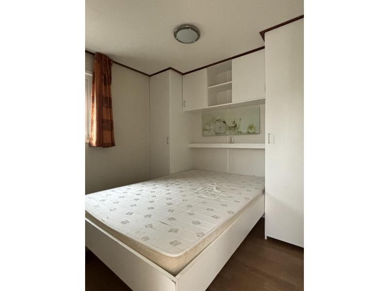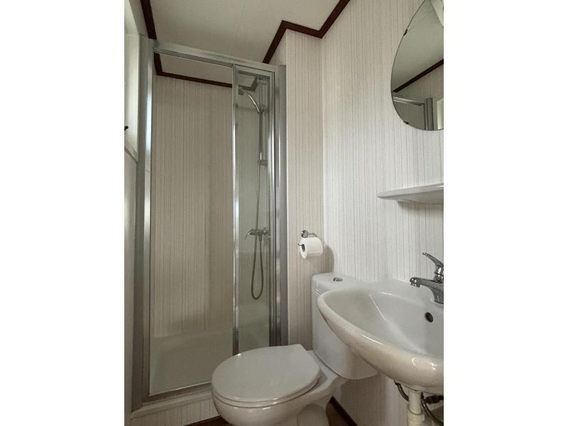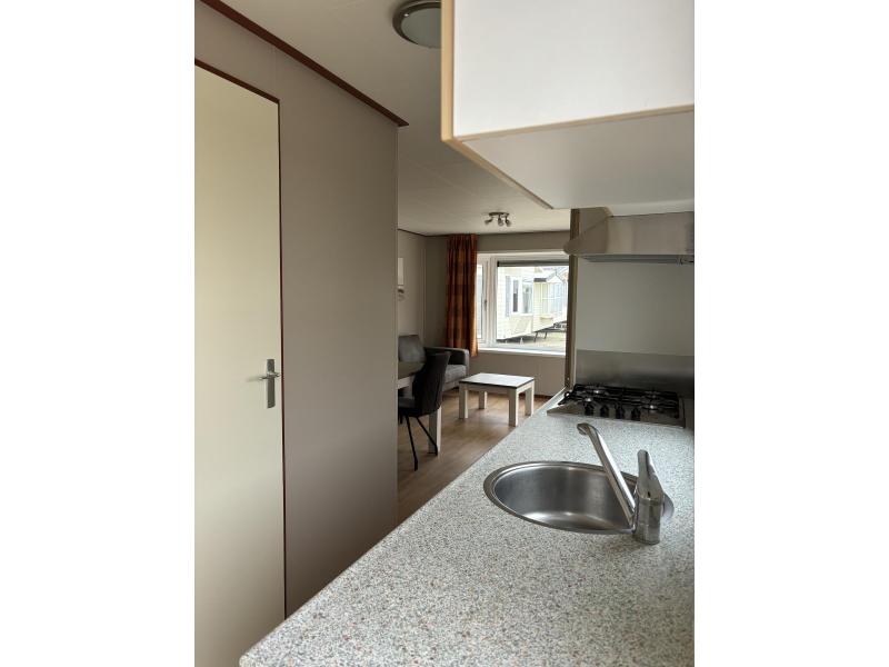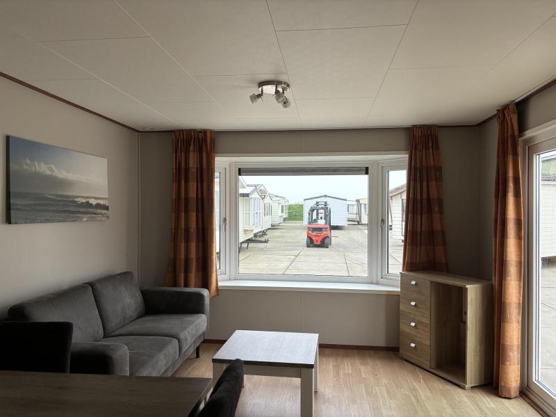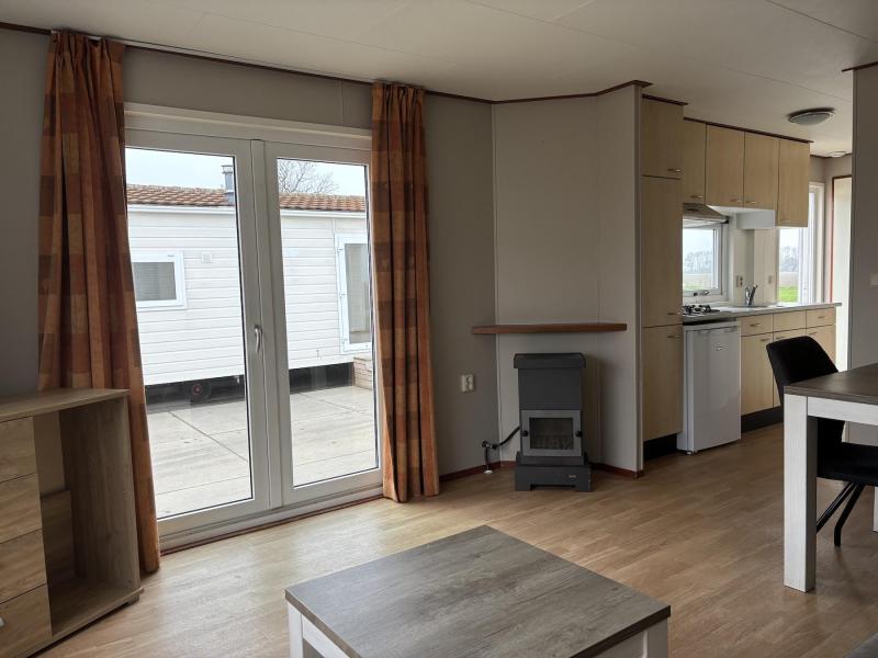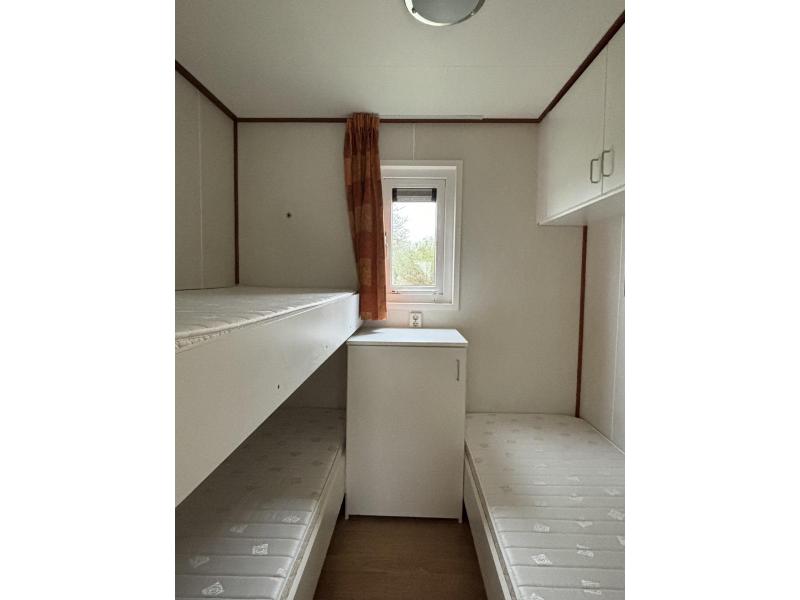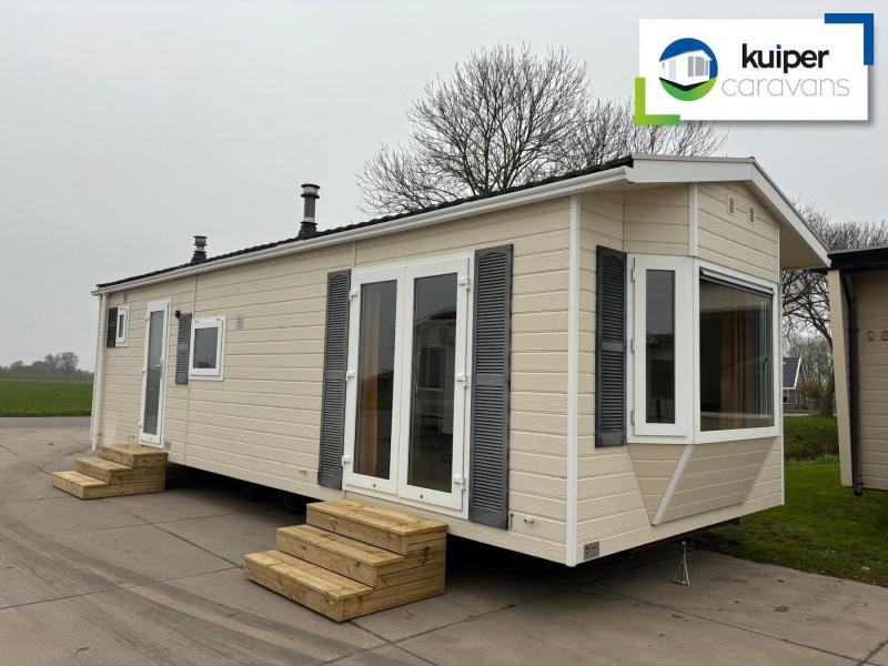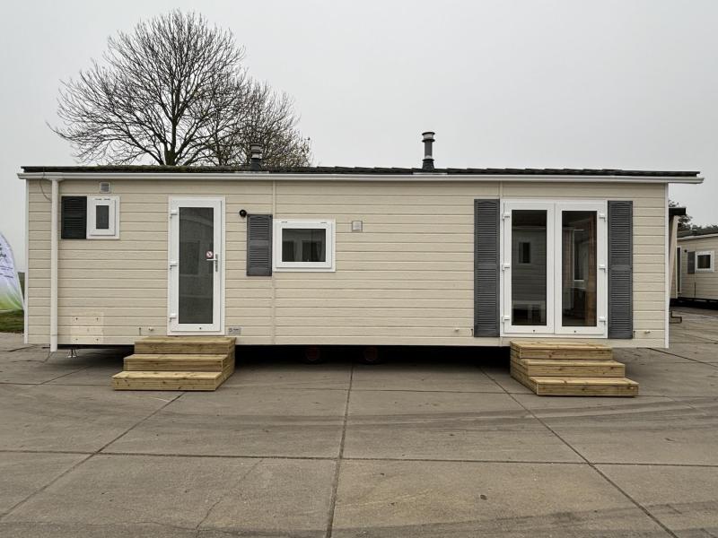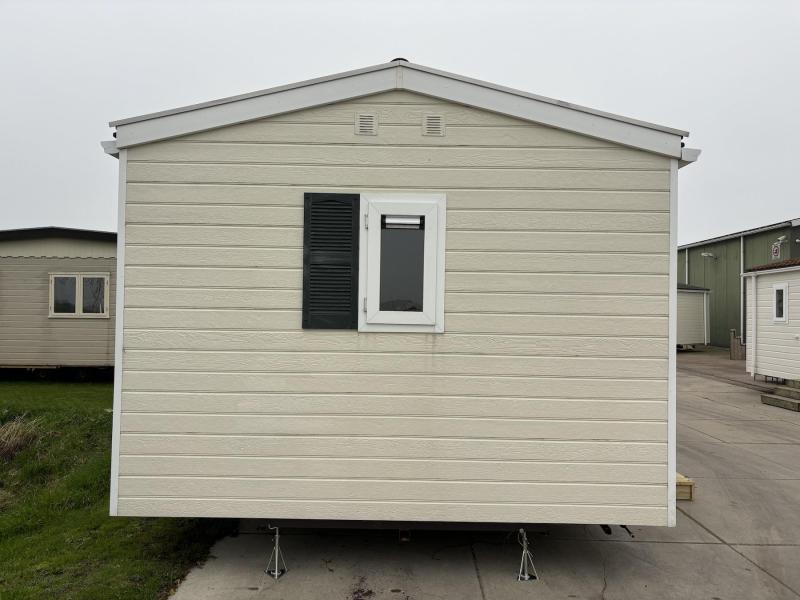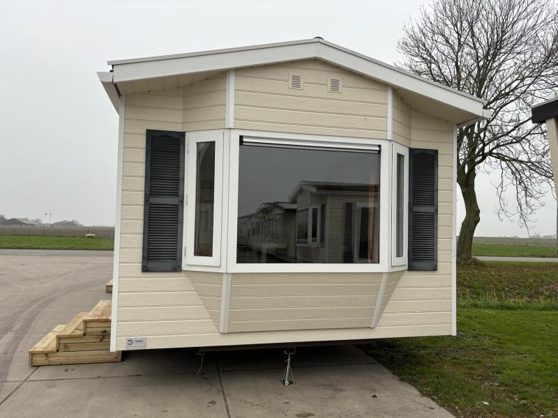 Dit AMS model is voorzien van kunststof buitenbeplating en decorative raamluiken. De woonkamer is ruim opgezet met een prachtige erker met twee openslaande ramen en word verwarmd middels een gaskachel.