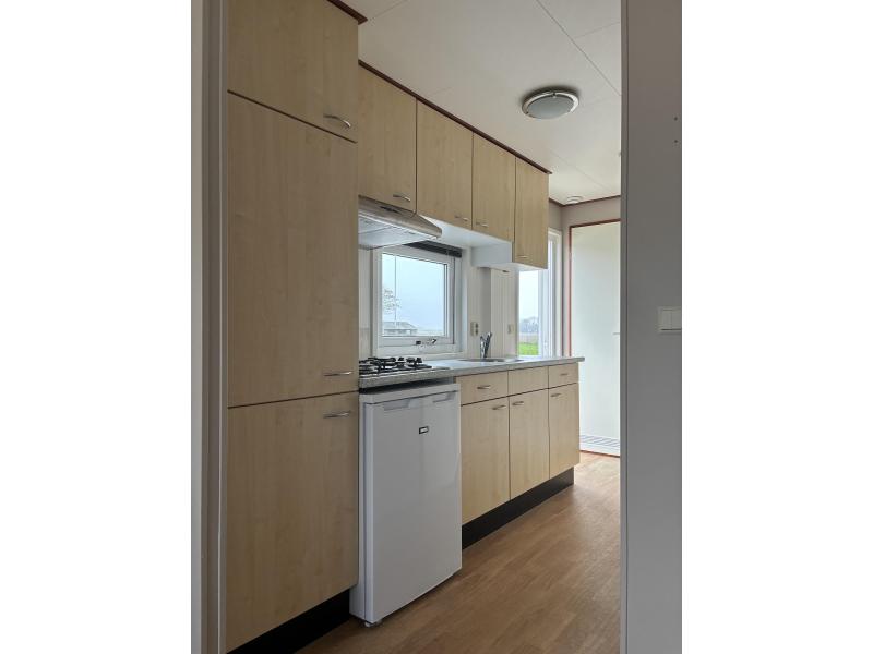 Voorzien van een gasstel, koelkast en veel opbergkasten.