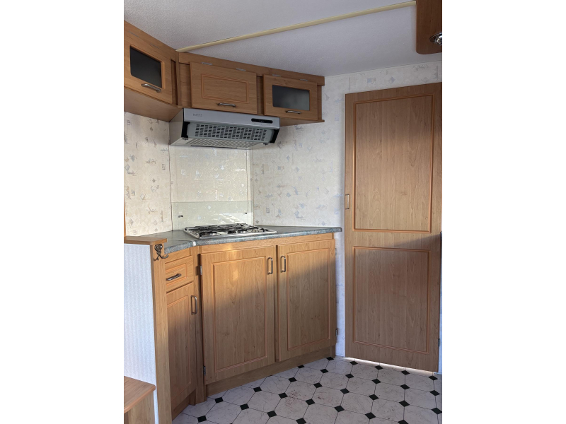 De keuken is ingedeeld in twee delen, wat dit een speelse keuken maakt. Er is een gaskookstel, koelkast, wasbak en meerdere opbergkasten voor al uw keukengerei aanwezig. In de keuken is net als de badkamer gekozen voor een vinyl vloerbekleding in een tegelprint.