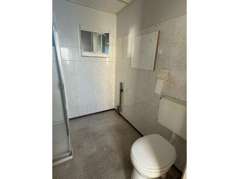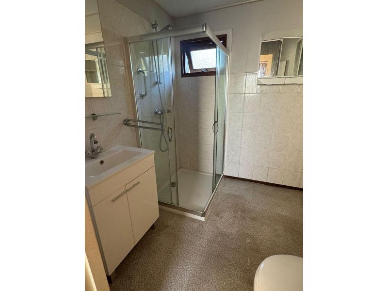 De badkamer heeft een grote douchekabine en een wastafel meubel met spiegelkastje. In de badkamer bevindt zich ook het toilet.