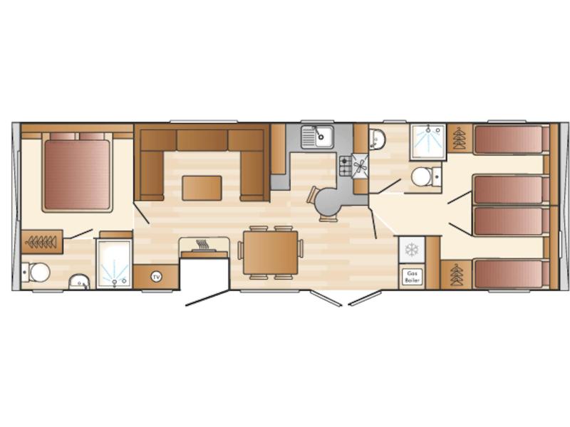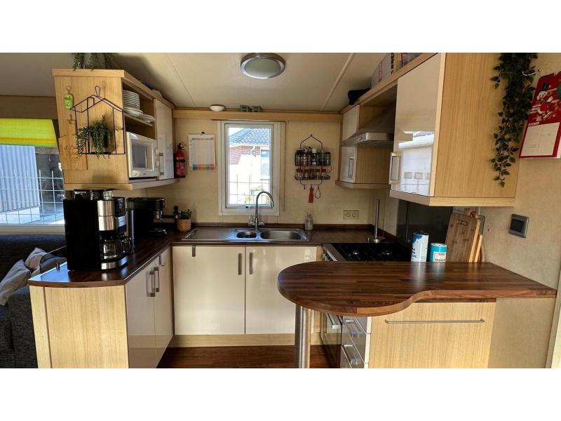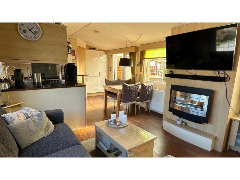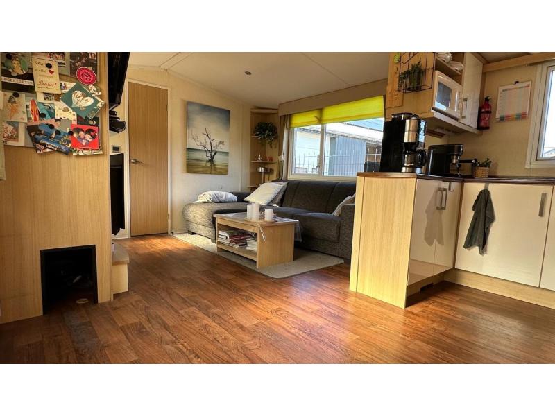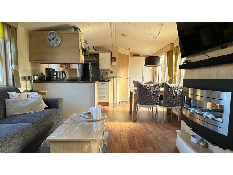 Wat deze stacaravan zo bijzonder maakt, is de centrale woonkamer. Dit houdt in dat aan iedere zijde van de woonkamer zich een slaapkamer(s) bevinden. In deze woonkamer is er ruime gelegenheid om te ontspannen op de grote hoekbank met salontafel en een sfeervolle elektrische sfeerhaard (De tv die u op de foto's kunt zien, wordt nog vervangen voor een ander model). Dit chalet wordt middels een centrale verwarming verwarmd, de sierkachel is in dit geval dus een extra toevoeging. Achter deze elektrische sfeerhaard bevindt zich een inpandige schuur, deze is te bereiken via de buitenzijde van het chalet middels een deur.