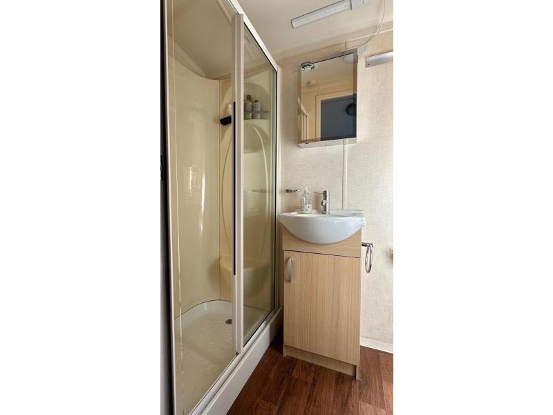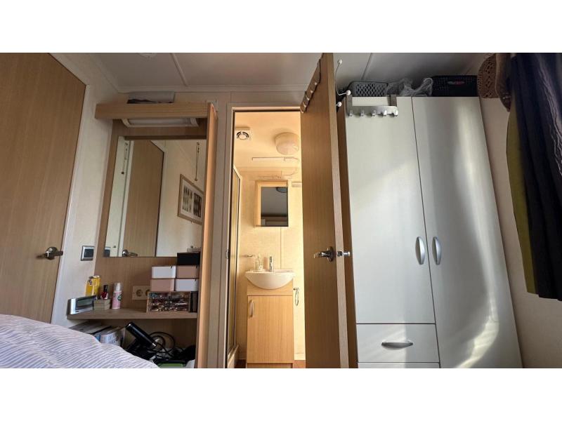 Dit chalet beschikt over 3 slaapkamers. De grote slaapkamer met tweepersoonsbed en ensuite badkamer bevindt zich aan de linkerzijde van het chalet. In deze kamer staat een grote opbergkast, meerdere kleine opbergkasten boven het bed en een verzorgingstafel/hoek met spiegel. De overige twee slaapkamers bevinden zich aan de rechterzijde van het chalet. Bij binnenkomst van deze slaapkamers ziet u de hoge opbergkast. De slaapkamers hebben beide twee eenpersoonsbedden, tussen deze bedden staat een nachtkastje, hierboven hangen twee kleine opbergkasten met een wandplank waar u bijvoorbeeld decoratie in kunt plaatsen of kunt gebruiken als extra opbergruimte.