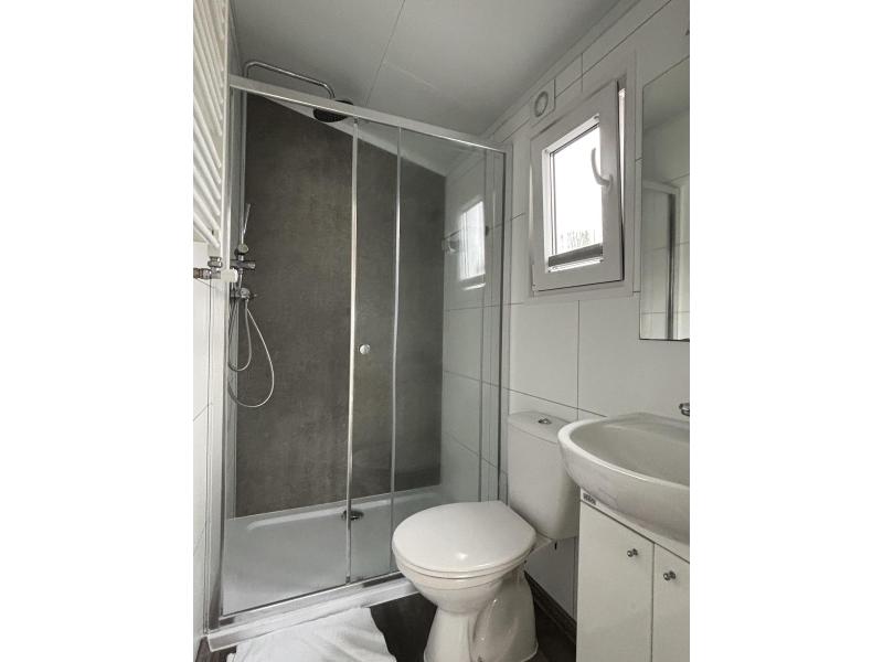 De badkamer heeft een hele ruime douche, een toilet en een wastafel met badkamermeubel en spiegelkastje.